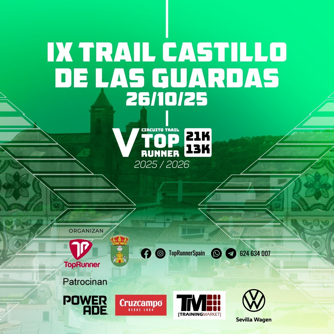 La Delegación de Deportes del Excelentísimo Ayuntamiento de El Castillo de las Guardas y Top Runner te recordamos que tienes una cita ineludible el 26 de octubre de 2025, la primera prueba del V Circuito Trail Top Runner en el Castillo de las Guardas, Sevilla.